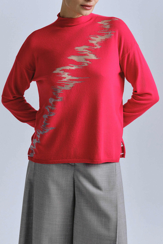 Вязаный джемпер водолазка тонкого вязания , полуприлегающего силуэта с длинным рукавом и  горловиной стойкой. По бокам разрезы. С полупрозрачным эффектным вуалевым рисунком по стану изделия.