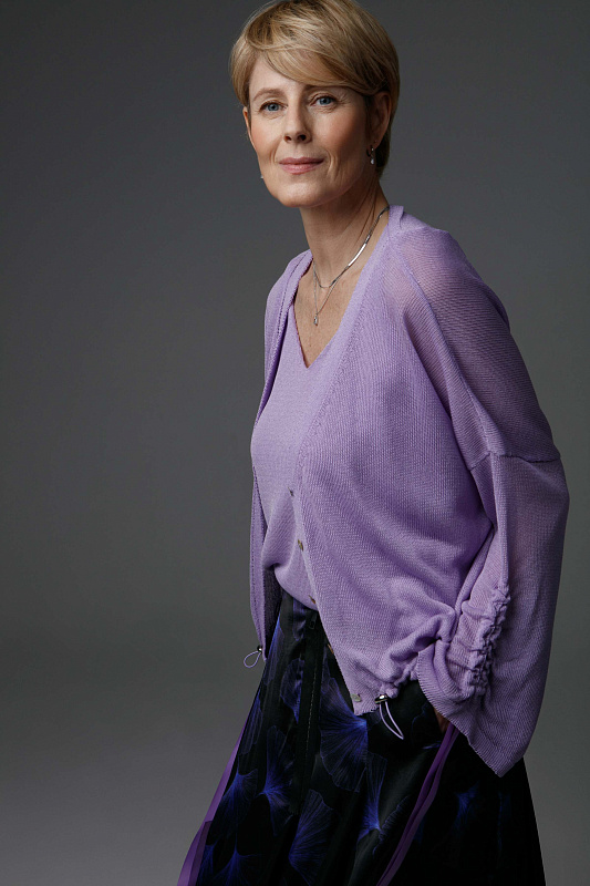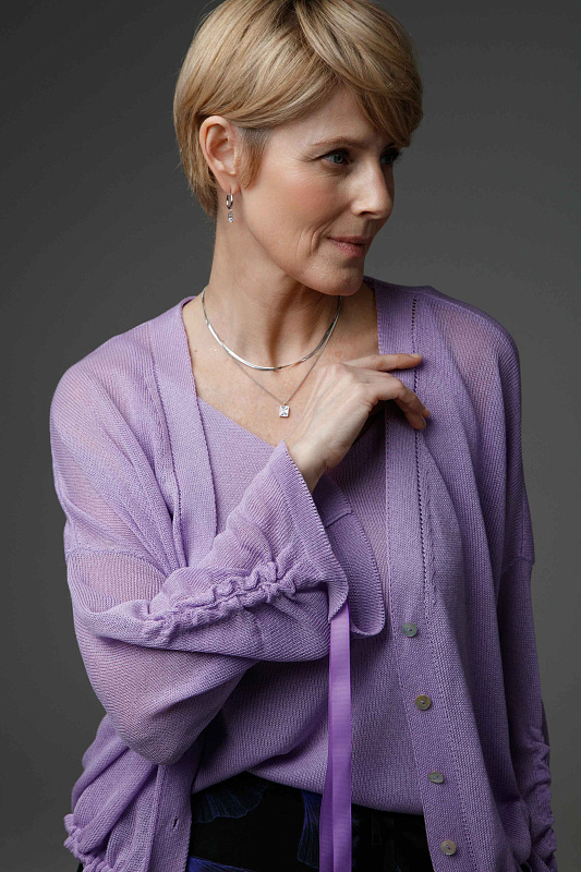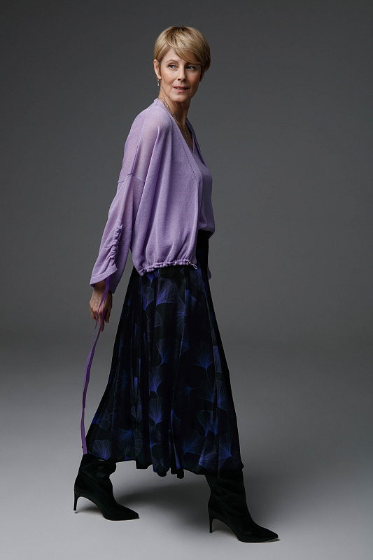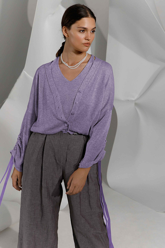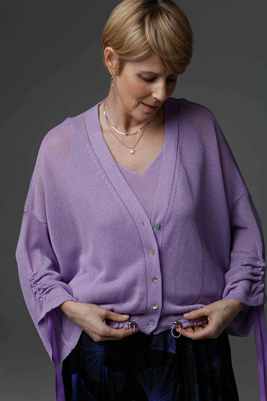Легкий и комфортный кардиган прямого силуэта с кулиской по низу изделия и V- образной горловиной. С широким рукавом с драпировкой и эффектными завязками из декоративной ленты. Полупрозрачное струящееся полотно. Модель выполнена из тонкой и нежной Итальянской вискозы с мерцающим блеском.