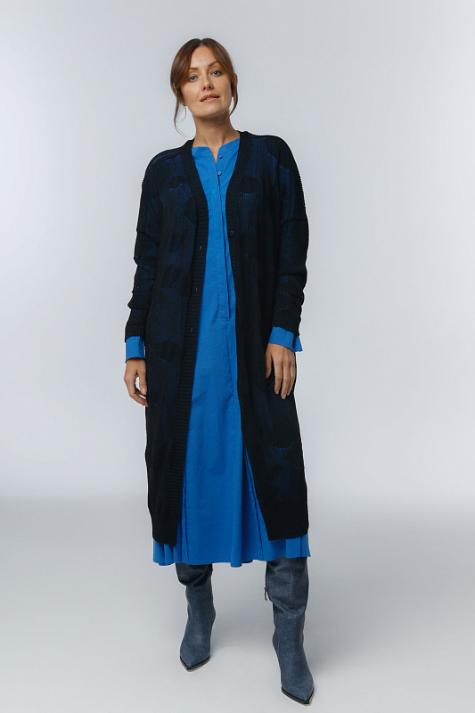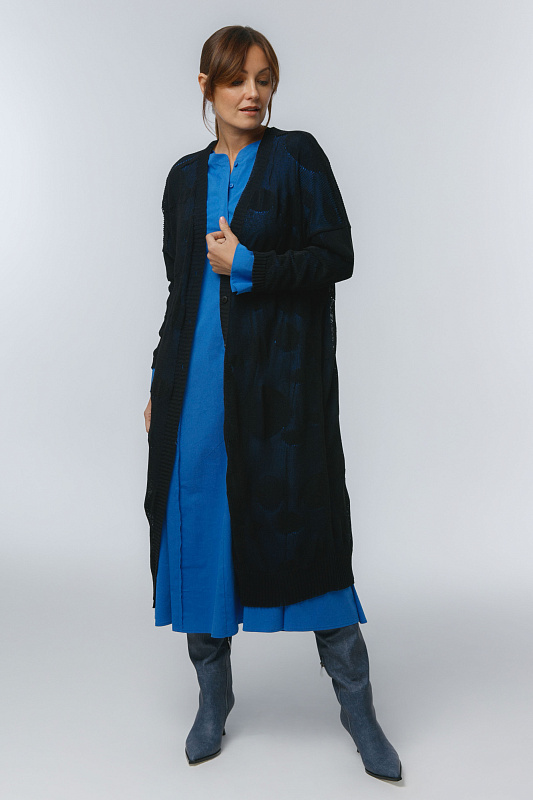Вязаный удлиненный кардиган с длинным рукавом, с рисунком в виде кругов на полупрозрачном полотне. С вывязанной эластичной застежкой на маленькие пуговицы.