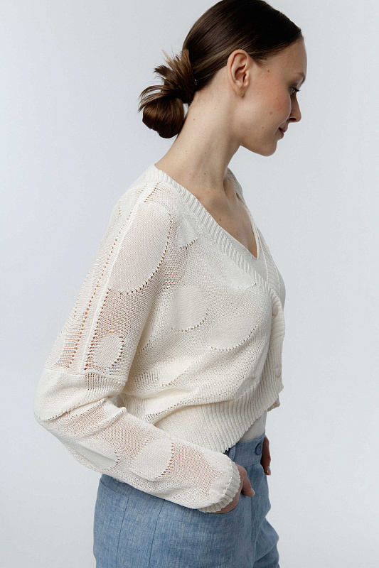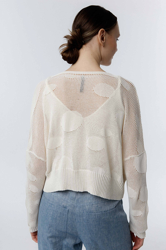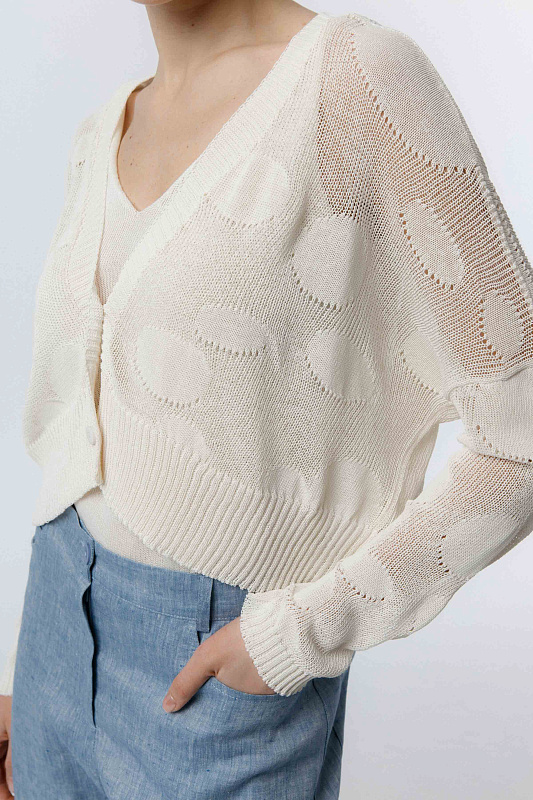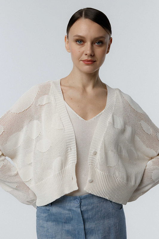 Вязаный укороченный кардиган - болеро с длинным рукавом, с рисунком в виде кругов на полупрозрачном полотне. С эластичной застежкой на маленькие пуговицы.