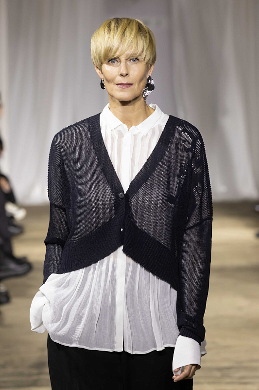 Вязаный укороченный кардиган - болеро с длинным рукавом, с рисунком в виде элегантной цветочной эмблемы на полупрозрачном полотне. Модель с вывязанной эластичной застежкой на маленькие пуговицы.