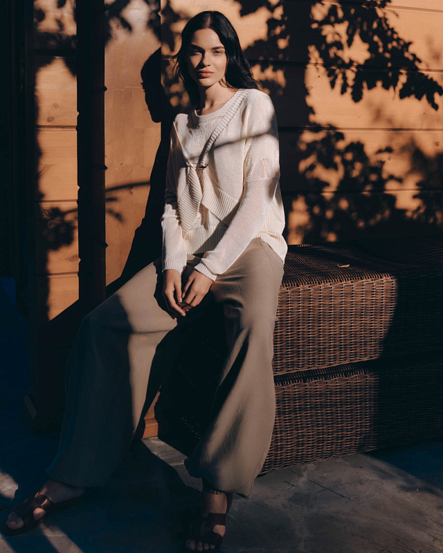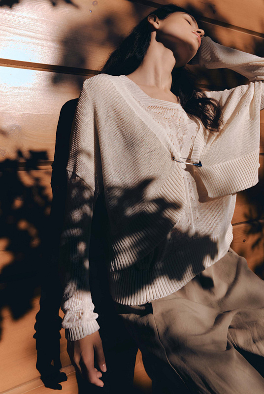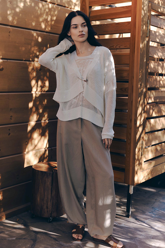Вязаный укороченный кардиган - болеро с длинным рукавом, с рисунком в виде элегантной цветочной эмблемы на полупрозрачном полотне. Модель с вывязанной эластичной застежкой на маленькие пуговицы.