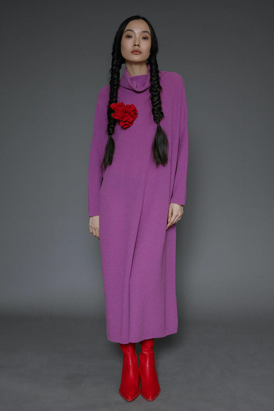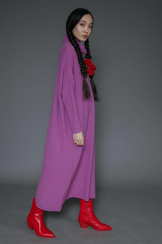 Вязаное длинное  платье из тонкой, мягкой и теплой буклированной пряжи. Выполнено изнаночной кулирной гладью. Спущенная линия плеча, воротник-хомут.