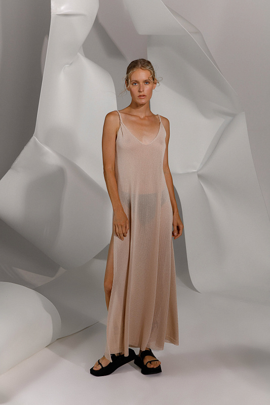 Легкое длинное платье в пол с эффектным высоким разрезом. Полупрозрачное струящееся полотно. Модель выполнена из тонкой и нежной Итальянской вискозы с мерцающим блеском.