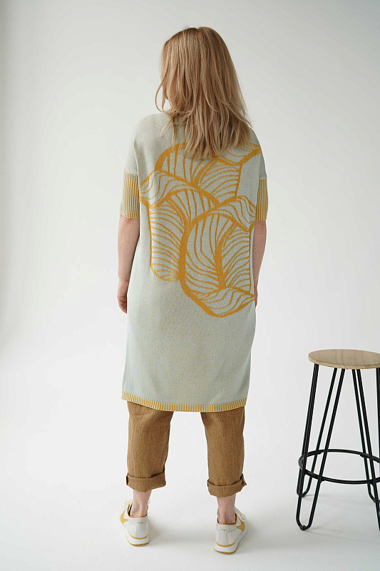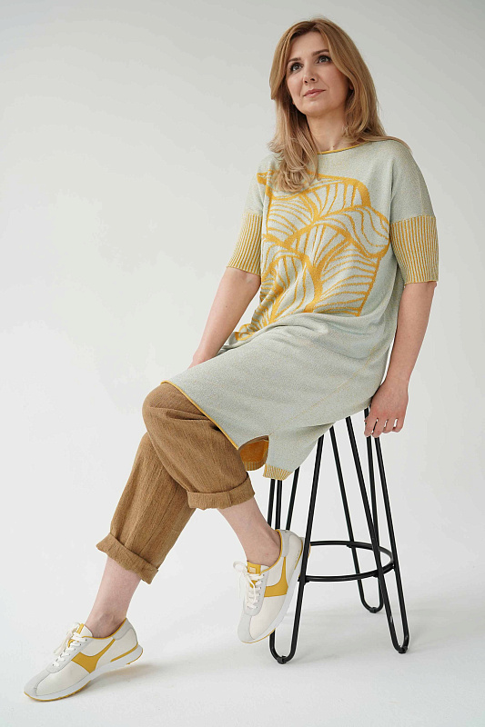 Струящееся платье прямого силуэта с разрезами по низу, с коротким рукавом в виде резинки, вырез горловины - лодочка. Платье выполнено из Итальянской глянцевой вискозы в технике меланж с рисунком переплетающихся листьев.