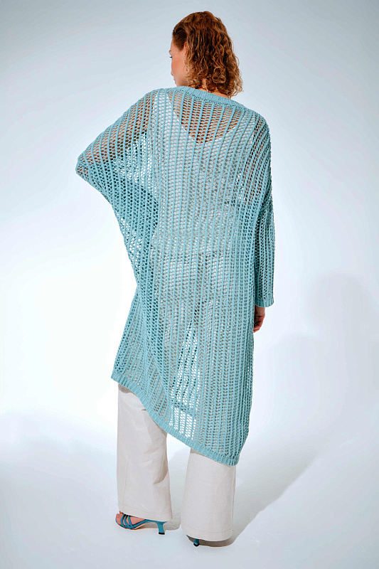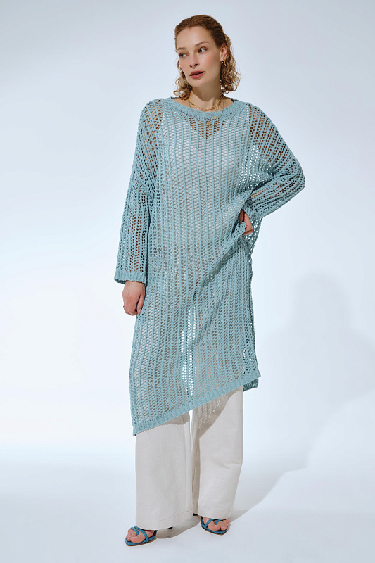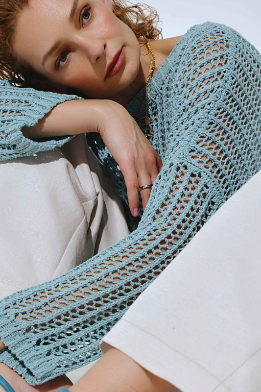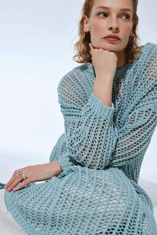 Вязаное платье прямого расслабленного силуэта с длинным рукавом и круглой горловиной. Выполнено из фасонной экологичной итальянской буклированной пряжи со льном из коллекции экологичных пряж. Изысканный вид придает ажурная техника вязания в сочетании с плотной вязкой в виде квадратов.