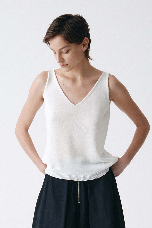 Базовый вязаный топ лаконичного силуэта с V-образной горловиной по переду и спинке. Модель является частью непроходящего элемента женского гардероба и может быть использована для создания разных образов.