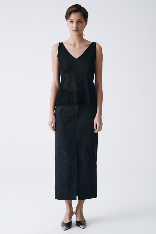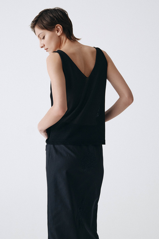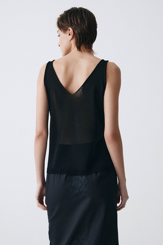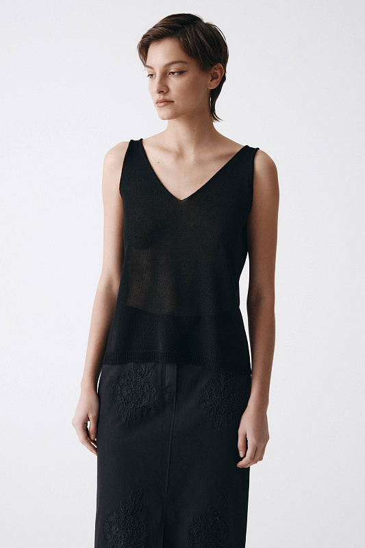 Базовый вязаный топ лаконичного силуэта с V-образной горловиной по переду и спинке. Модель является частью непроходящего элемента женского гардероба и может быть использована для создания разных образов.