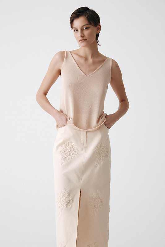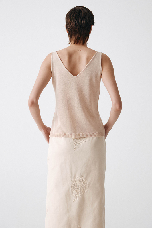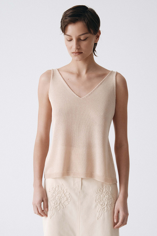 Базовый вязаный топ лаконичного силуэта с V-образной горловиной по переду и спинке. Модель является частью непроходящего элемента женского гардероба и может быть использована для создания разных образов.