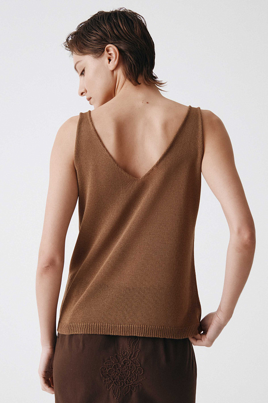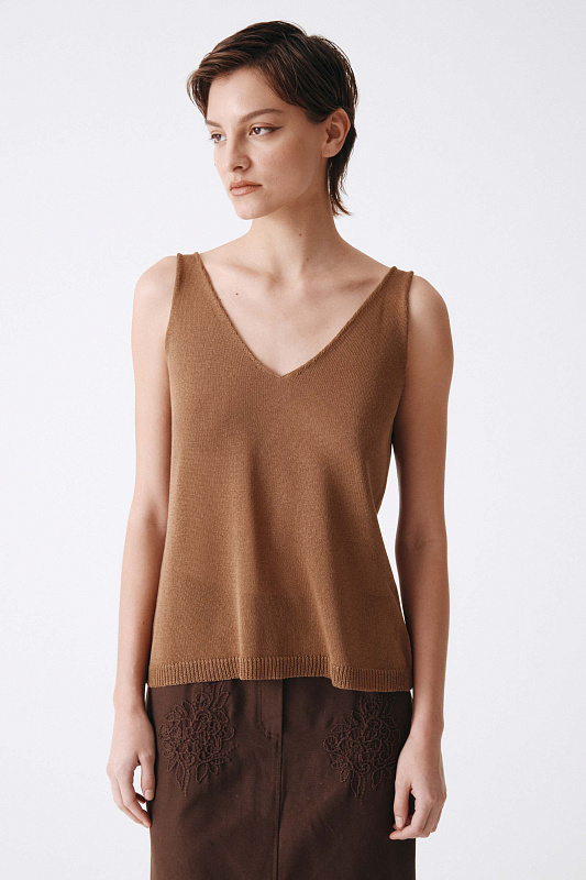Базовый вязаный топ лаконичного силуэта с V-образной горловиной по переду и спинке. Модель является частью непроходящего элемента женского гардероба и может быть использована для создания разных образов.