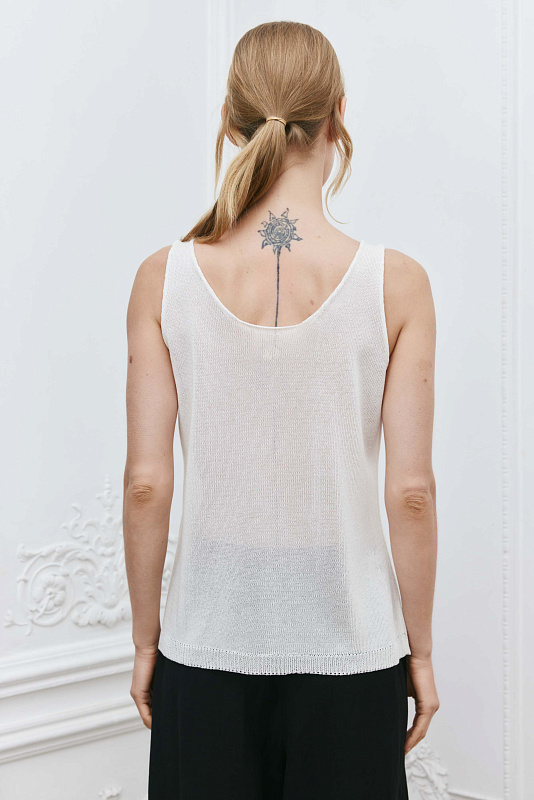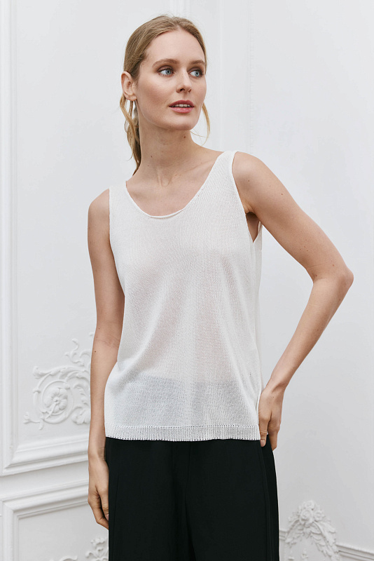Базовый вязаный топ лаконичного силуэта с круглой горловиной по переду и спинке. Модель является частью непроходящего элемента женского гардероба и может быть использован для создания разных образов.