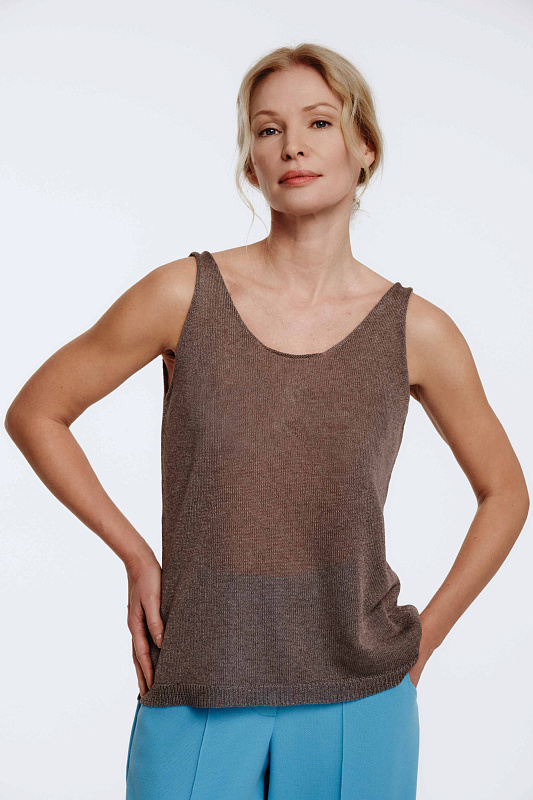 Базовый вязаный топ лаконичного силуэта с круглой горловиной по переду и спинке. Модель является частью непроходящего элемента женского гардероба и может быть использован для создания разных образов.