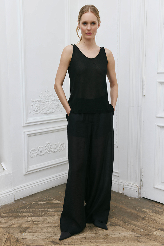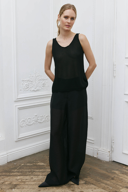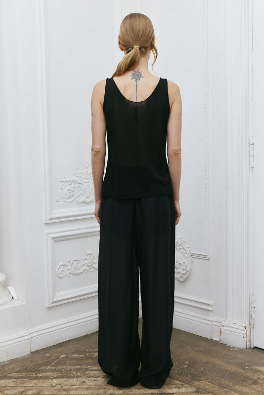 Базовый вязаный топ лаконичного силуэта с круглой горловиной по переду и спинке. Модель является частью непроходящего элемента женского гардероба и может быть использован для создания разных образов.