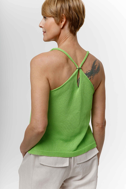 Вязаный топ прямого силуэта на тонких бретелях, соединенных на спинке за счёт декоративного металлического кольца. Рекомендуем снимать кольцо перед стиркой изделия. Элемент по спинке придает топу спортивного шика. Модель выполнена из тонкой и нежной Итальянской вискозы с мерцающим блеском.