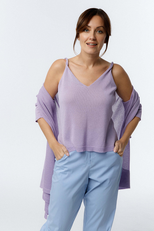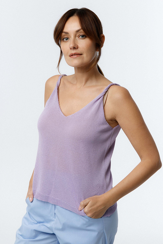 Вязаный топ прямого силуэта с перекрученными бретелями. Полупрозрачное струящееся полотно. Модель выполнена из тонкой и нежной Итальянской вискозы с мерцающим блеском