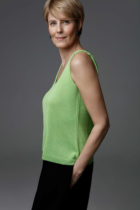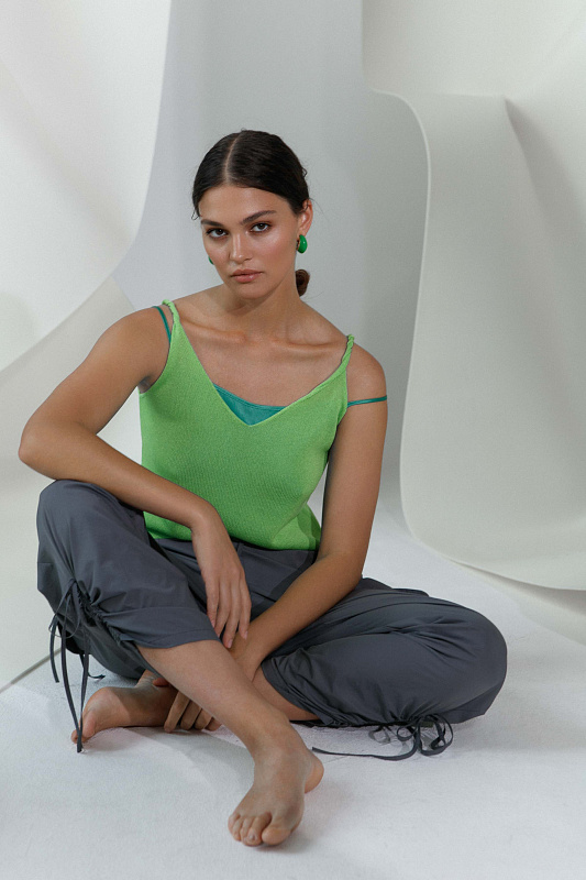 Оригинальный топ прямого силуэта с перекрученными бретелями. Полупрозрачное струящееся полотно. Модель выполнена из тонкой и нежной Итальянской вискозы с мерцающим блеском.
