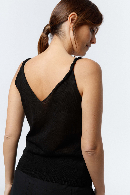 Вязаный топ прямого силуэта с перекрученными бретелями. Полупрозрачное струящееся полотно. Модель выполнена из тонкой и нежной Итальянской вискозы с мерцающим блеском
