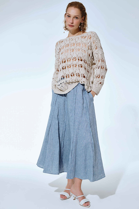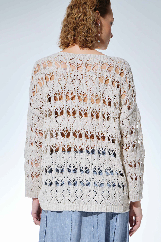 Вязаная туника прямого расслабленного силуэта с длинным рукавом и круглой горловиной. Выполнена из фасонной экологичной итальянской буклированной пряжи со льном из колекции экологичных пряж в авторской крупной ажурной технике вязания.