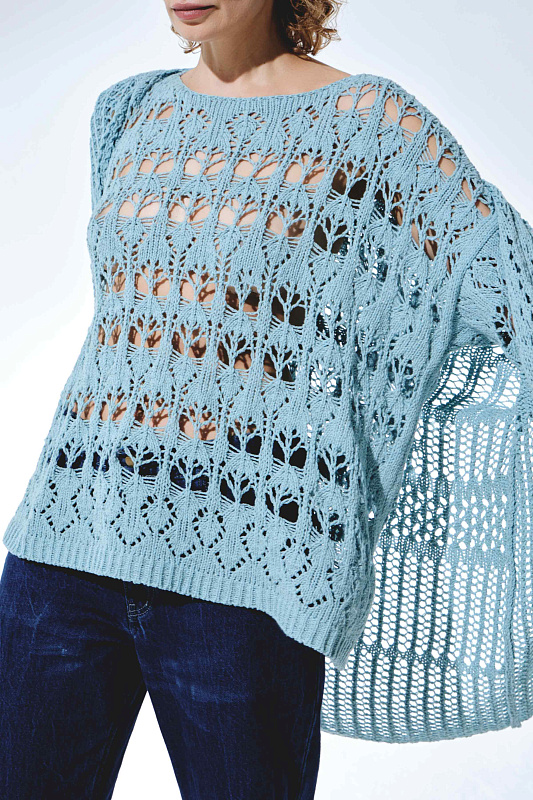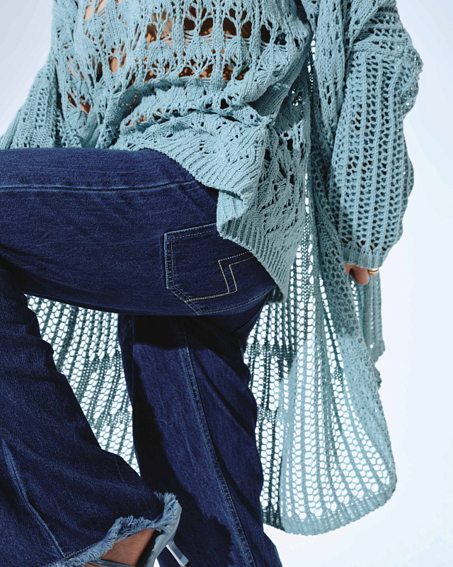 Вязаная туника прямого расслабленного силуэта с длинным рукавом и круглой горловиной. Выполнена из фасонной экологичной итальянской буклированной пряжи со льном из колекции экологичных пряж в авторской крупной ажурной технике вязания.