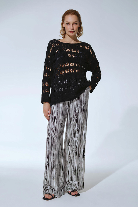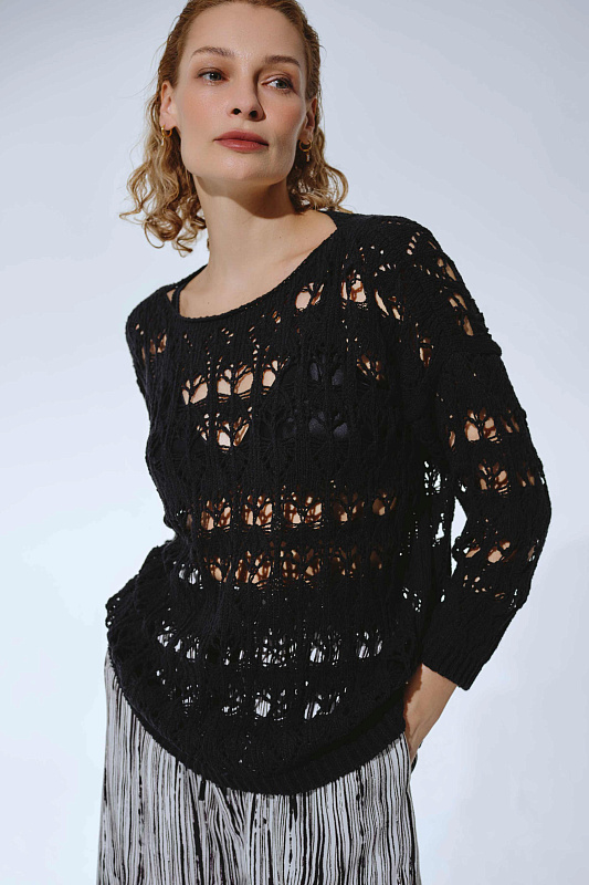 Вязаная туника прямого расслабленного силуэта с длинным рукавом и круглой горловиной. Выполнена из фасонной экологичной итальянской буклированной пряжи со льном из колекции экологичных пряж в авторской крупной ажурной технике вязания.