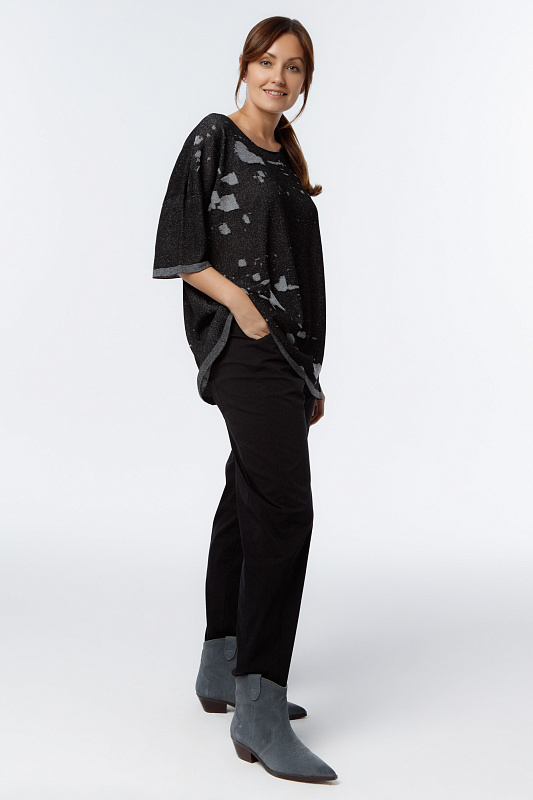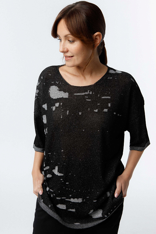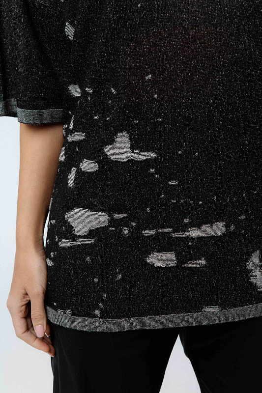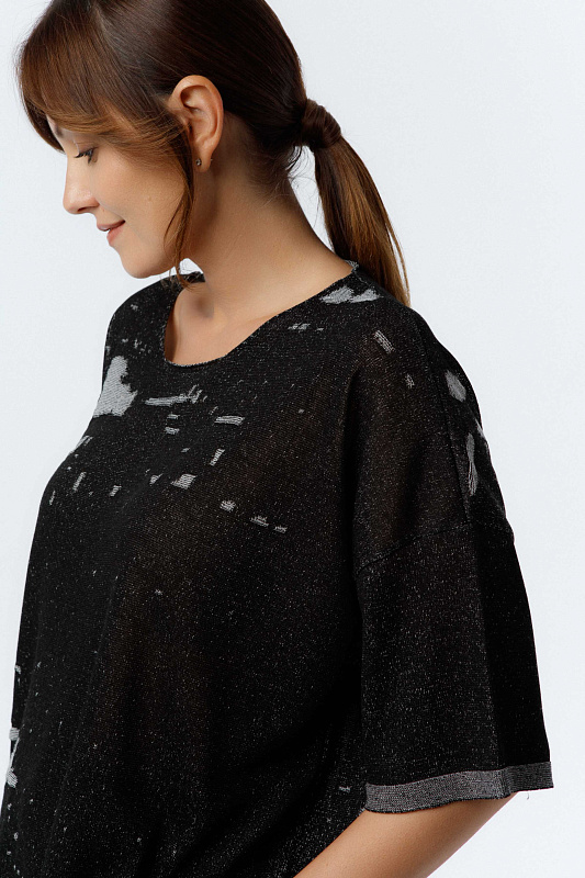 Вязаная туника с прямым коротким рукавом со спущенной линией плеча и круглой горловиной; с текстурным рисунком по стану изделия.
