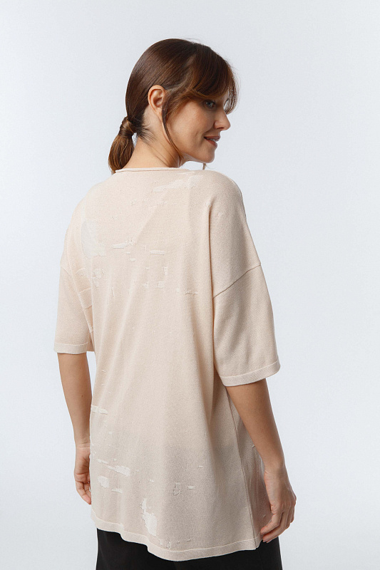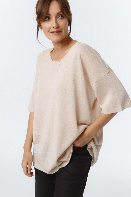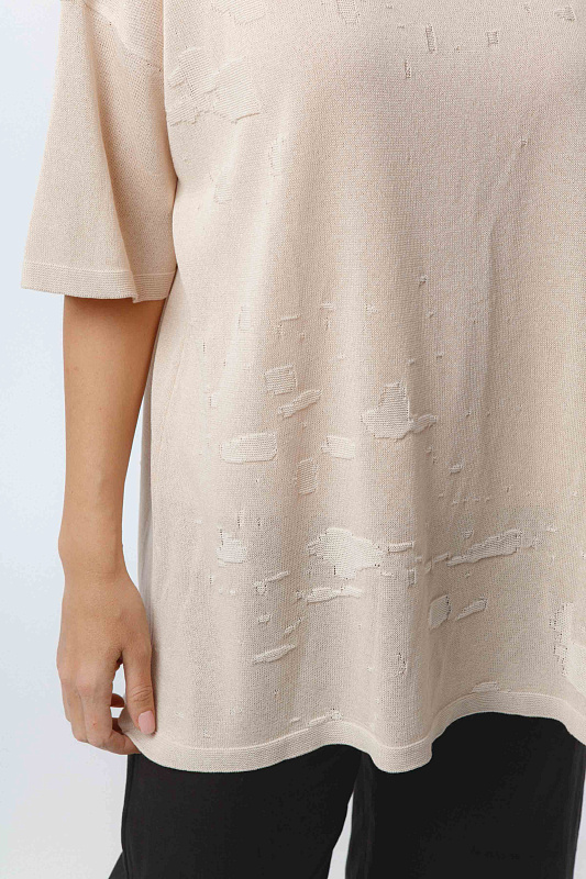Вязаная туника с прямым коротким рукавом со спущенной линией плеча и круглой горловиной; с текстурным рисунком по стану изделия.