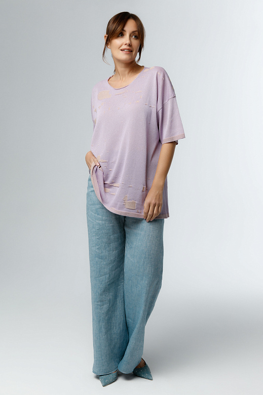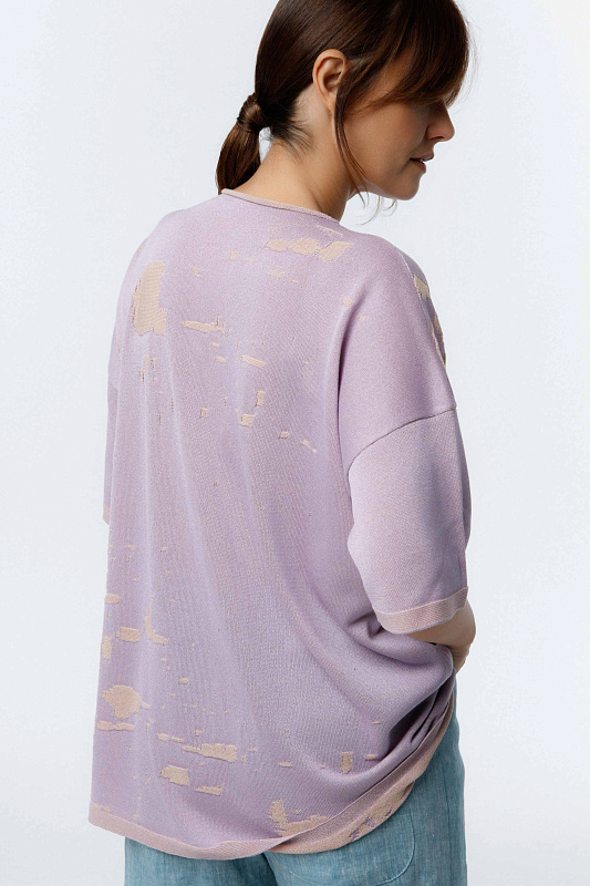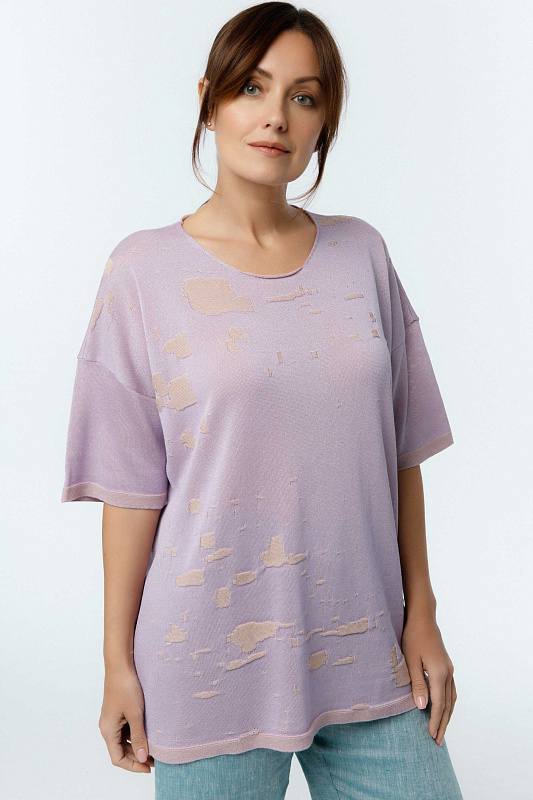 Вязаная туника с прямым коротким рукавом со спущенной линией плеча и круглой горловиной; с текстурным рисунком по стану изделия.