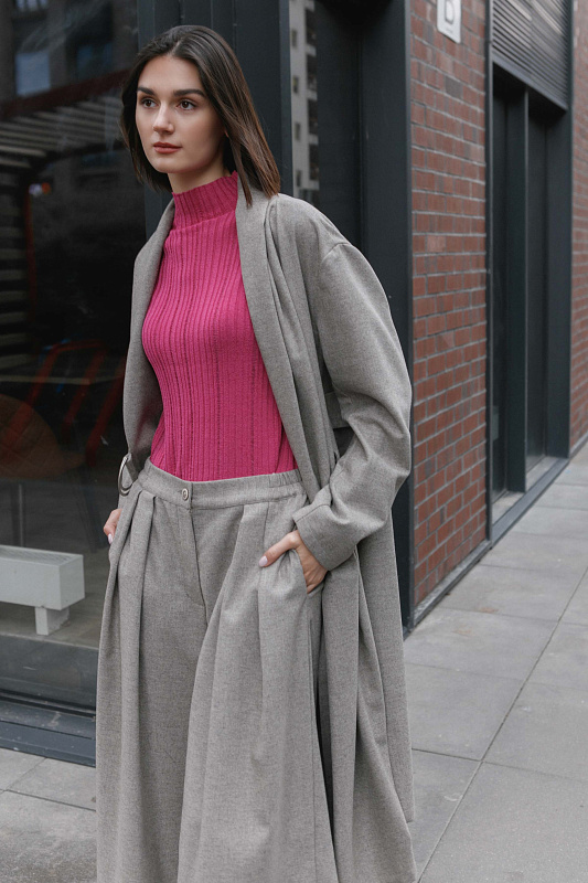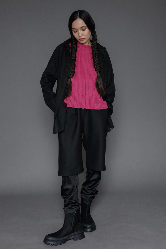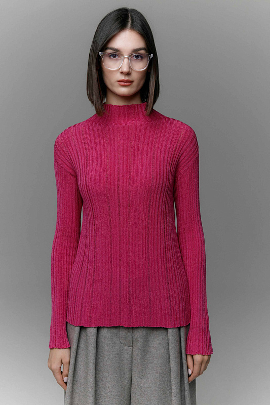 Вязаный джемпер - водолазка полуприлегающего силуэта, горловина - невысокая стойка, длинный рукав. Выполнен из итальянской крепированной струящейся вискозы ластичным переплетением с протяжками. В контрастных вариантах модели рисунок выкладывается за счет хаотичного распределения нитей разных цветов.