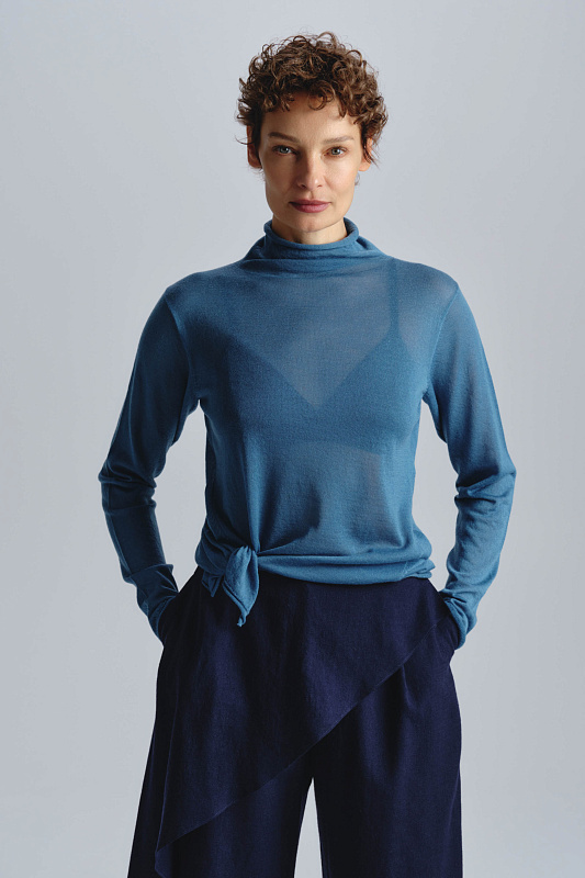 Очень легкий и уютный изящный вязаный джемпер-водолазка с асимметричной отлетной деталью с боку. Джемпер выполнен из 100% кашемира итальянской фабрики премиум-класса и объединяет ценность пряжи с мягкостью полотна и силуэта. Рекомендуем завязывать отлетную деталь на узел. После каждой стирки полотно будет «раскрывать» свой пушистый ворс все сильнее.