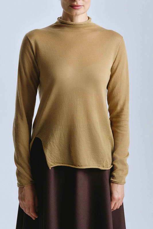 Очень легкий и уютный изящный вязаный джемпер-водолазка с асимметричной отлетной деталью с боку. Джемпер выполнен из 100% кашемира итальянской фабрики премиум-класса и объединяет ценность пряжи с мягкостью полотна и силуэта. Рекомендуем завязывать отлетную деталь на узел. После каждой стирки полотно будет «раскрывать» свой пушистый ворс все сильнее.