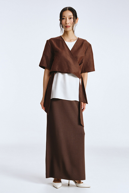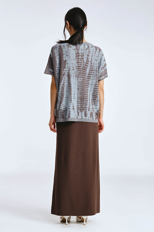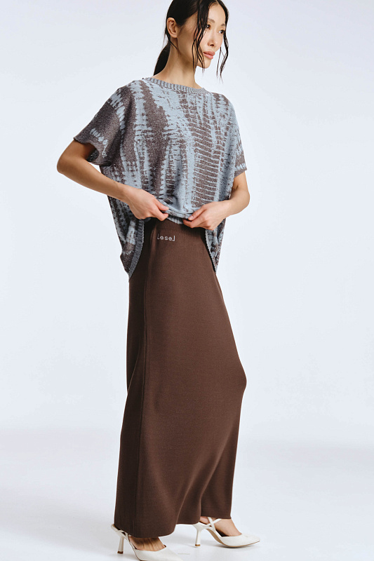 Вязаная эластичная юбка на резинке силуэта «карандаш» с вывязанным логотипом марки. Выполнена жаккардовым переплетением , которое придает полотну мягкость форм и струящийся эффект, а также выгодно подчеркивает удлиненный силуэт.