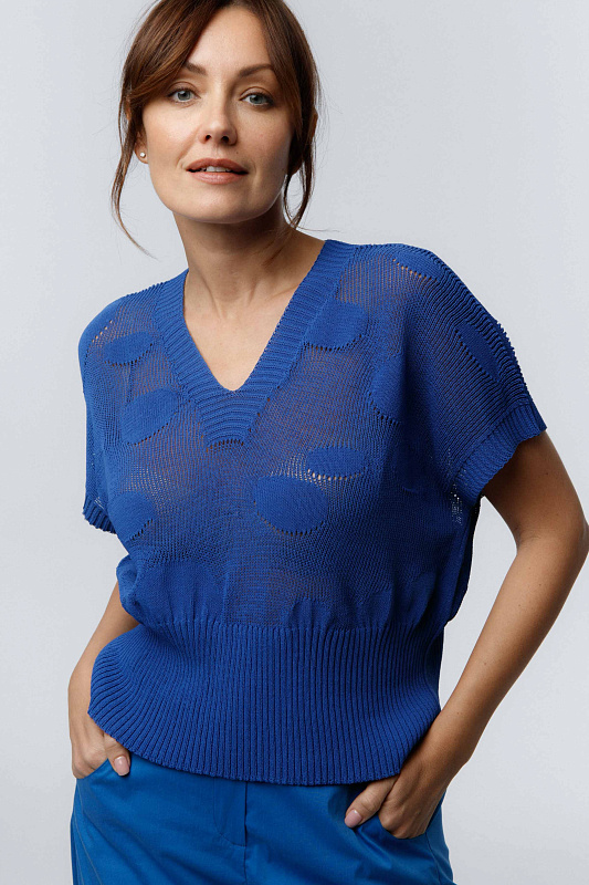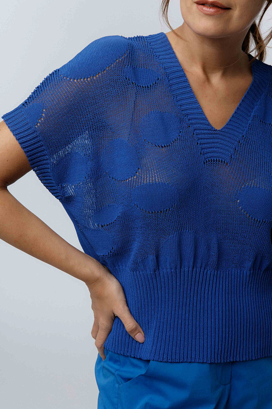 Вязаный жилет с коротким рукавом, с рисунком в виде кругов на полупрозрачном полотне. По низу изделия высокая эластичная резинка. V- образная горловина.