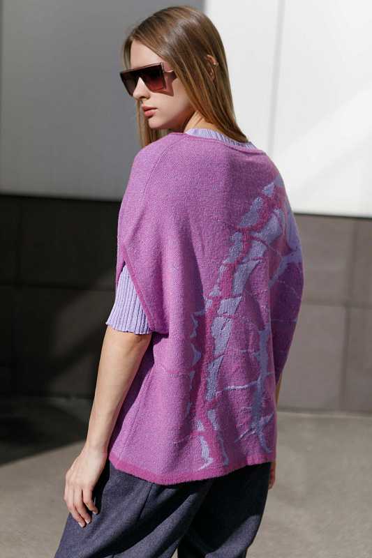 Вязаный пушистый жилет из тонкой буклированной пряжи с контрастным глянцевым монорапортным узорчатым мотивом. Увеличенная пройма жилета позволяет стилизовать изделие поверх рубашки с широким рукавом или водолазки. Силуэт – «ромб», круглый вырез горловины.