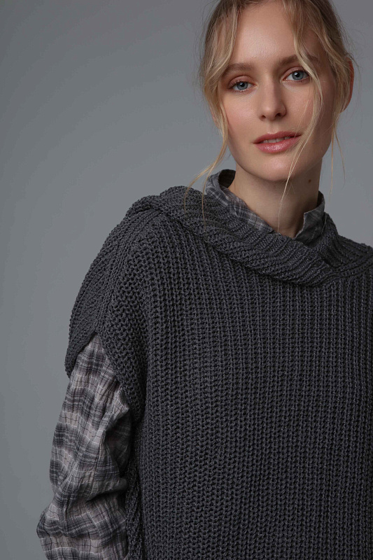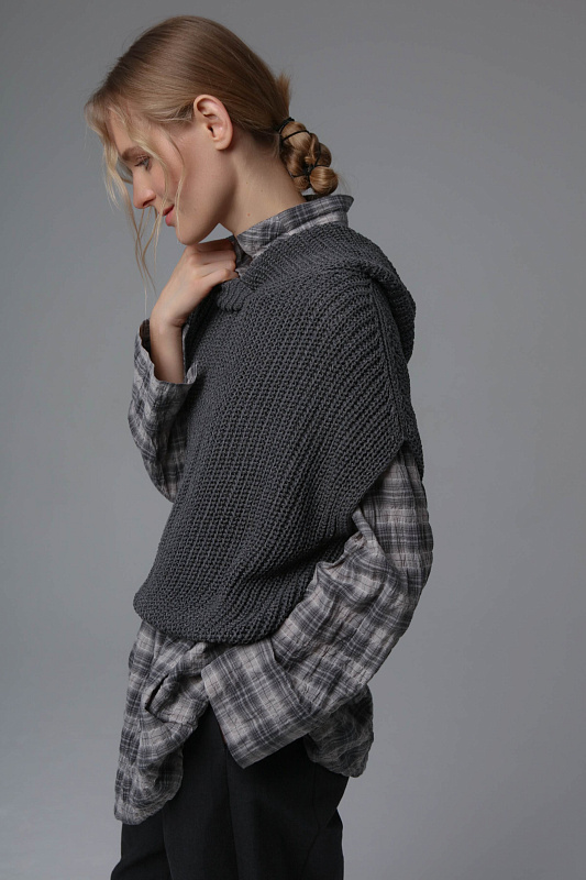 Цельновязаный жилет с коротким рукавом, вальяжным капюшоном и с эластичной резинкой по низу изделия. Выполнен в технике воздушного переплетения, которое придает изделию плавность линий силуэта. Из экологичной итальянской пряжи с ненавязчивым мерцающим эффектом. В составе пряжи присутствуют восстановленные волокна.