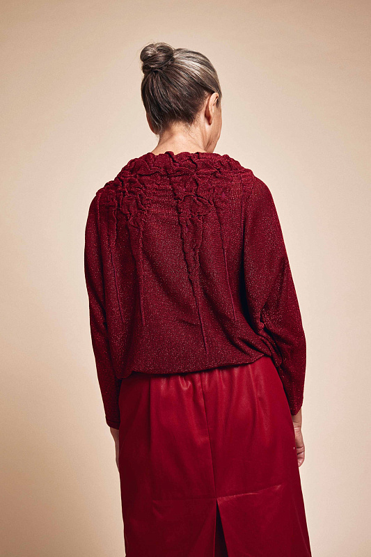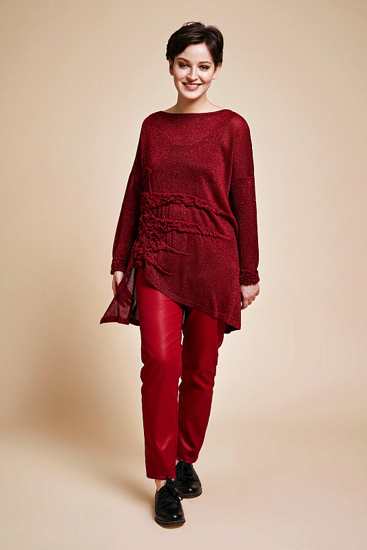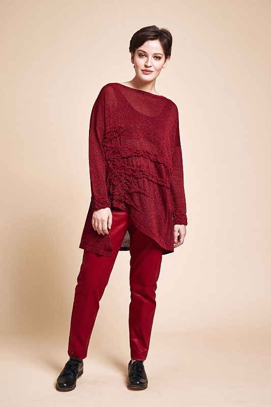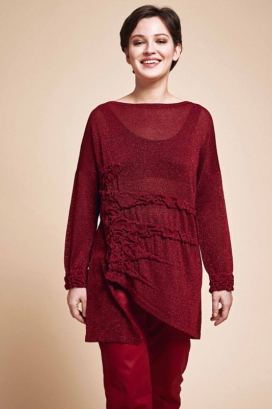 Туника с длинным рукавом и вырезом горловины лодочка прямого силуэта лимитированной коллекции Resort 2019. Полупрозрачное мерцающее полотно с люрексом комбинированной вязки - соединение сложной объемной фактуры с гладкой, влияющей на конструкцию модели. Благородный блеск помогает создать многогранный и элегантный образ как для повседневного, так и для вечернего выхода.