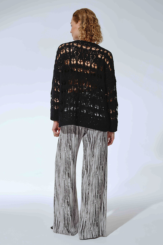 Вязаная туника прямого расслабленного силуэта с длинным рукавом и круглой горловиной. Выполнена из фасонной экологичной итальянской буклированной пряжи со льном из колекции экологичных пряж в авторской крупной ажурной технике вязания.