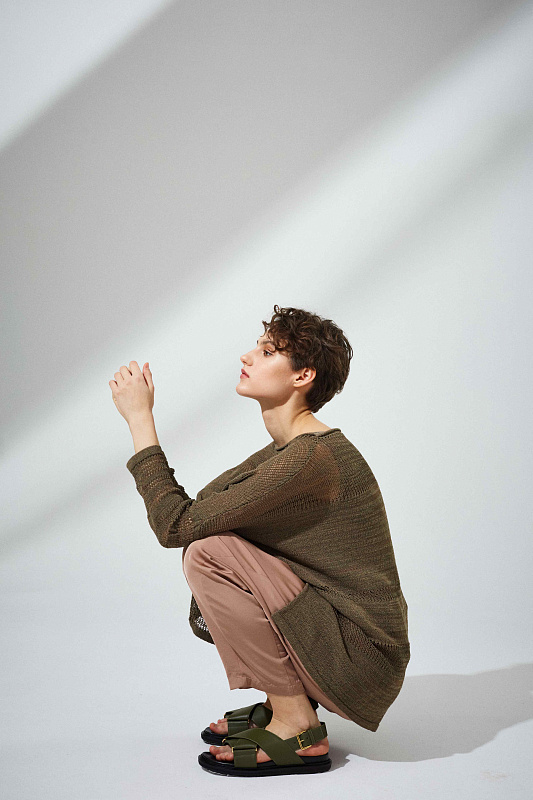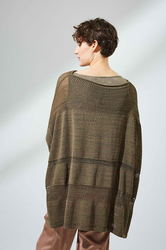 Туника из мягкого итальянского хлопка. Спущенная линия плеча, вырез горловины лодочка, длинный рукав. Пряжа неоднородной толщины создает фактуру неравномерного полотна. В модели использованы вставки ажурного переплетения.
