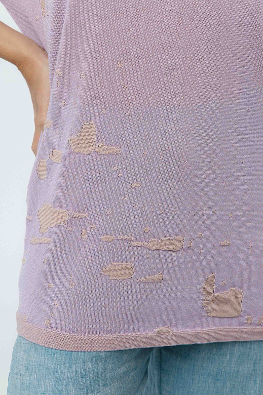 Вязаная туника с прямым коротким рукавом со спущенной линией плеча и круглой горловиной; с текстурным рисунком по стану изделия.