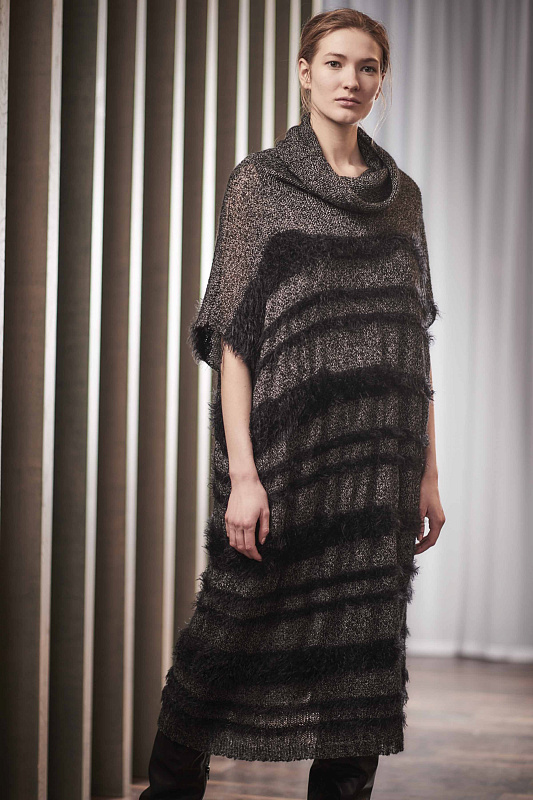 Полупрозрачная вязаная туника средней длины из пряжи на основе мохера с воротником хомут. Шикарная дизайнерская вещь. Очень красивое сочетание фактурной пряжи травка и мохера. Особенность этой модели - спущенная линия плеча