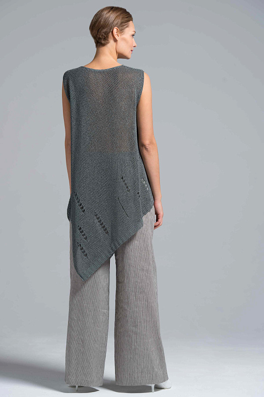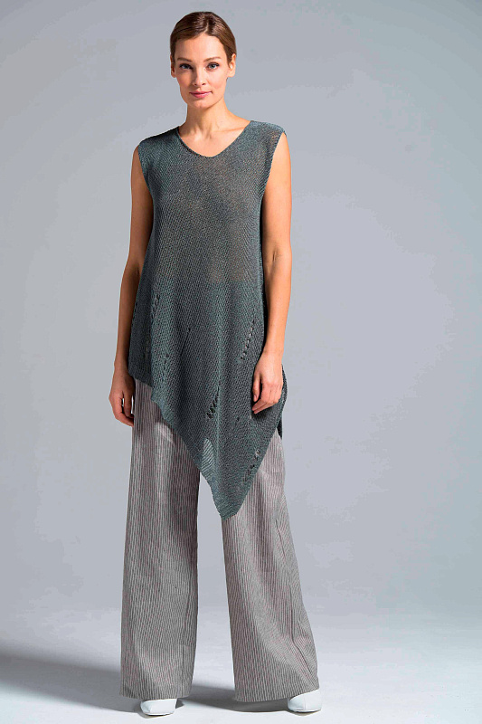 Туника-жилет Песок  А-силуэта, без рукавов, вырез горловины  - лодочка. Жилет с асимметричной  линией низа, удлиненной по левой стороне. Жилет идеально подойдет как на каждый день, так и на вечер. Модель выполнена из итальянской фантазийной пряжи.