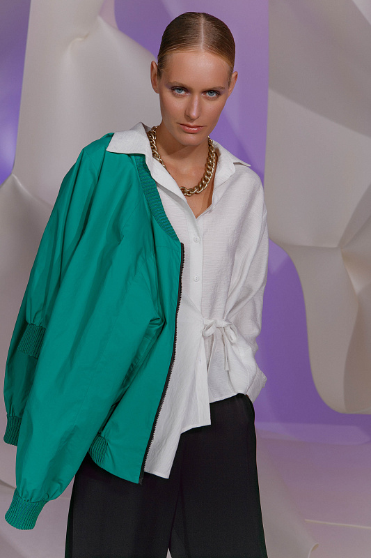 Трендовая куртка бомбер укороченного силуэта с вискозными подвязами. Застежка - молния. Модель на шелковистой вискозной подкладке.