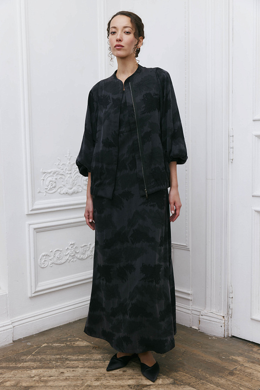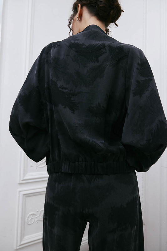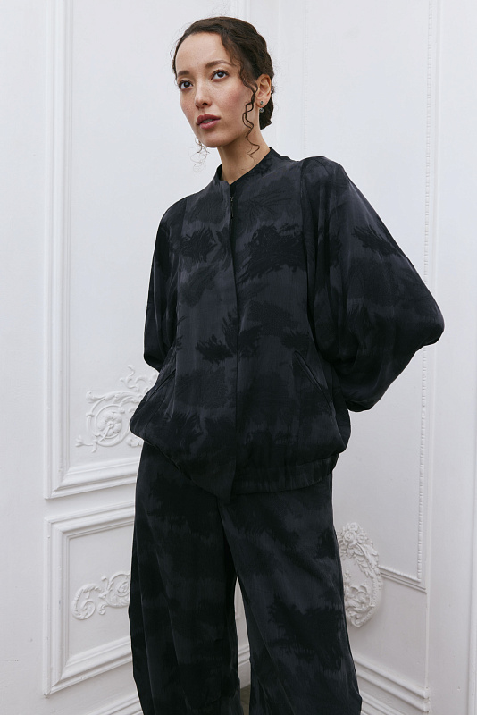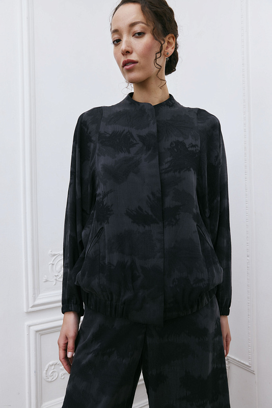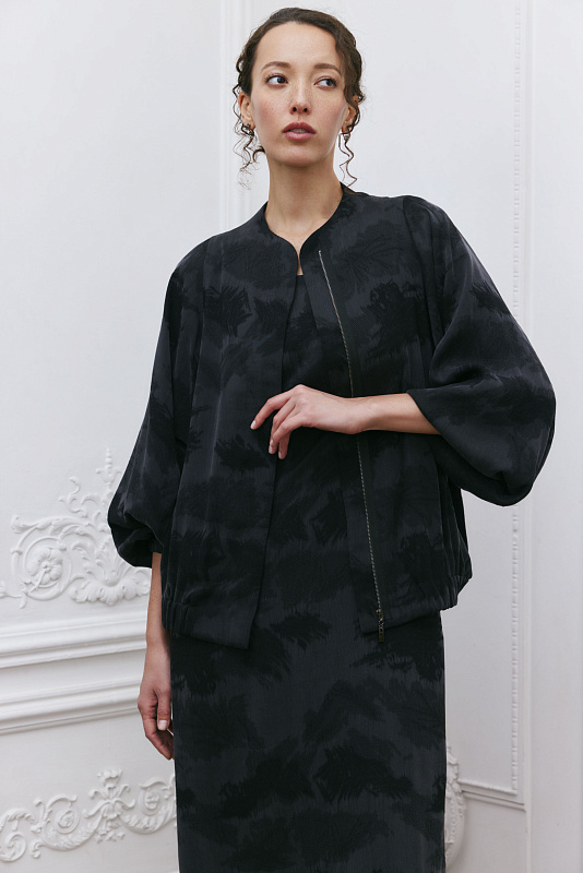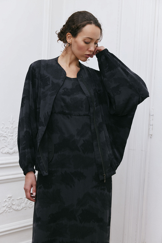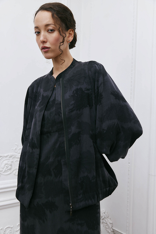 Дизайнерский, продуманный до мелочей элемент гардероба — куртка бомбер-ромб. Это лёгкая куртка с резинкой на манжетах и по низу. Широкий цельнокроеный рукав, который начинается с верхней точки плеча и постепенно сужается к запястью, создаёт свободный, летящий силуэт, придавая элегантность и женственность модели. Цельнокроеный воротник помогает придать изделию законченный вид. Карманы едва заметны из-за уникального узора ткани. Модель выполнена из жаккардовой ткани. Жаккард отличается сложным переплетением нитей и красивым рисунком. Застёжка-молния скрыта под планкой, создавая впечатление единого целого. Модель будет выглядеть эффектно и элегантно в дуэте с платьем арт. 5925300 из той же капсулы.