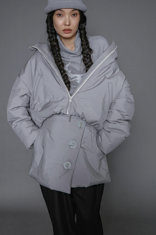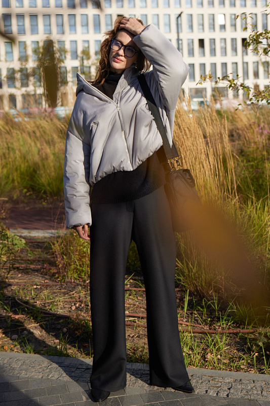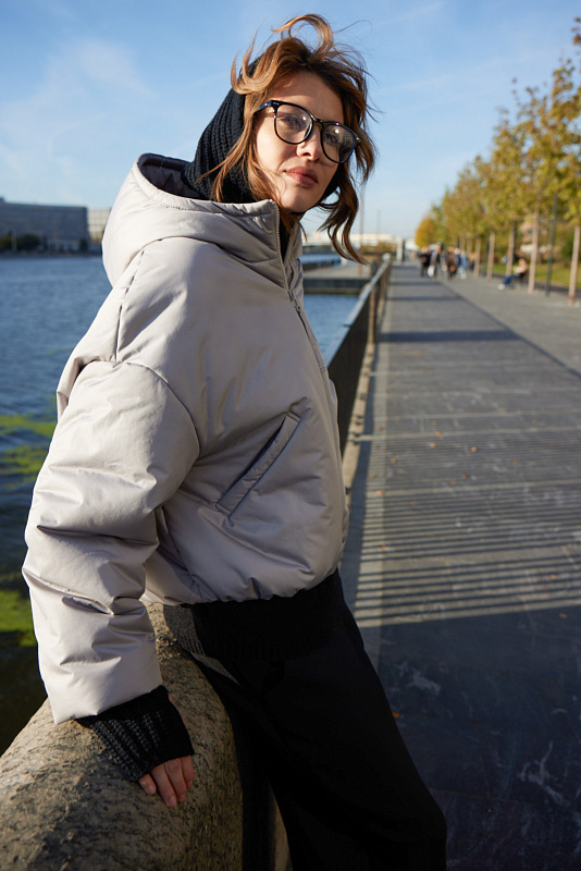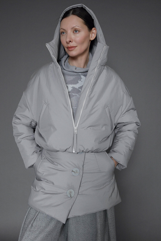 Куртка из гладкой ткани с современным утеплителем нового поколения. С внутренней стороны рукава и по внизу куртки предусмотрены резинки для защиты от ветра. Спущенная линия плеч. Застежка – тракторная молния. Подкладка из шелковистой вискозы. Удобный компактный капюшон с высоким воротником-стойкой. Глубокие прорезные карманы.