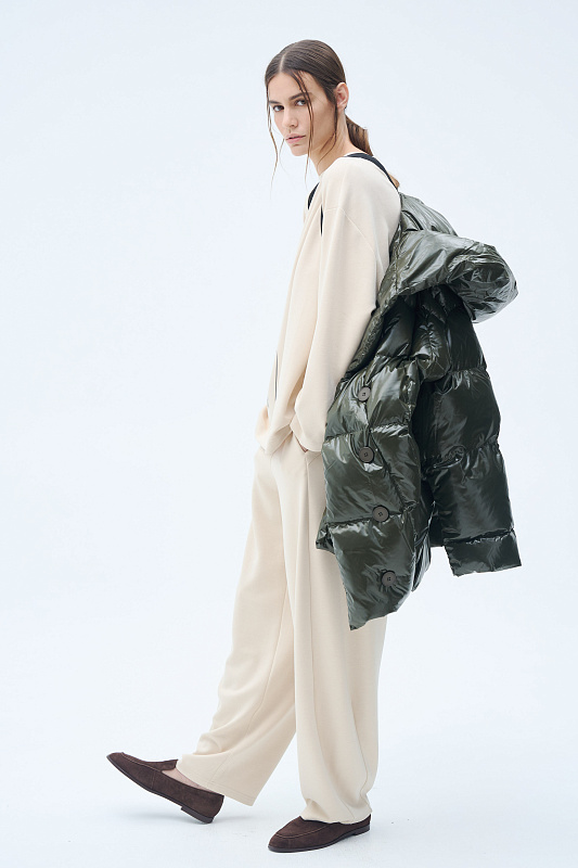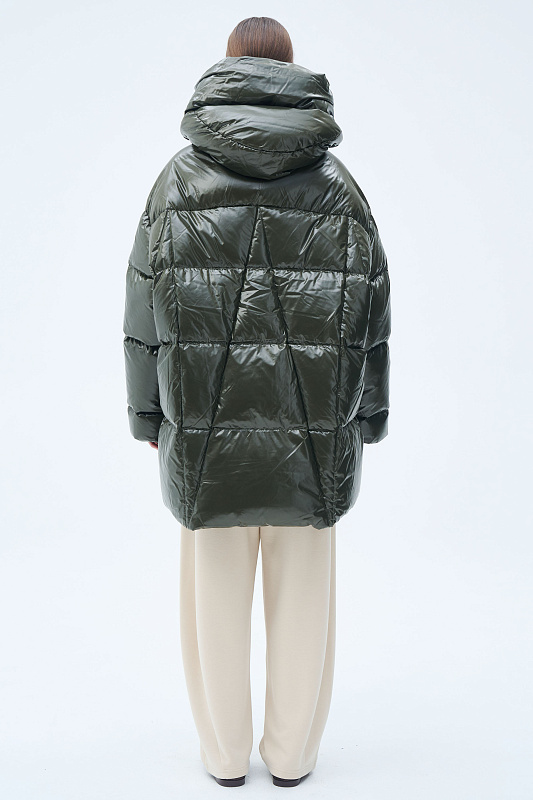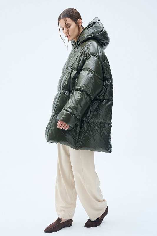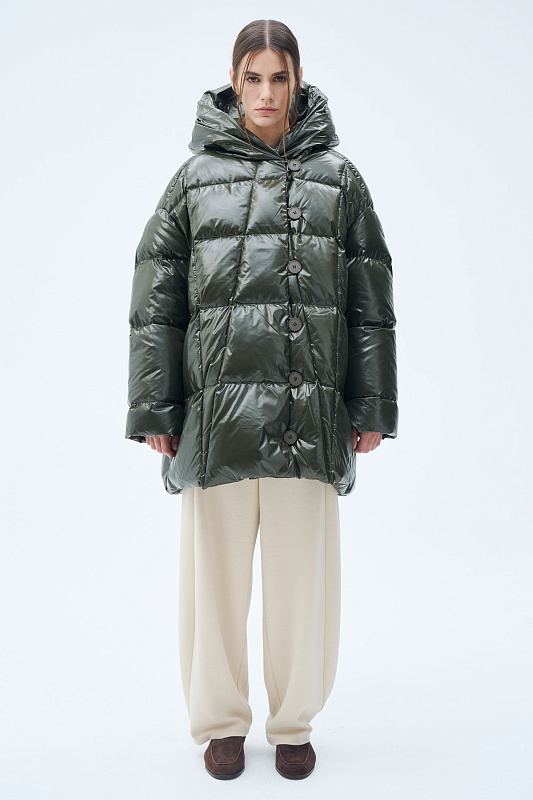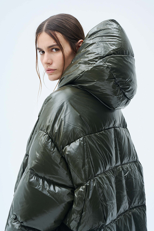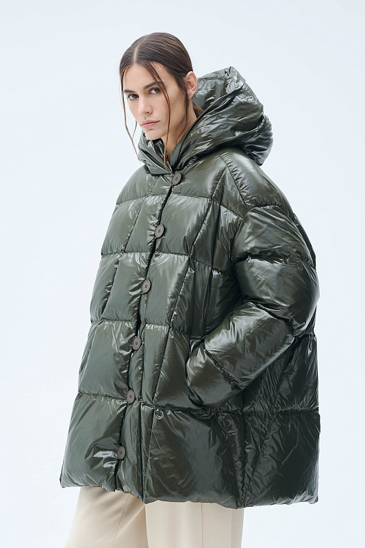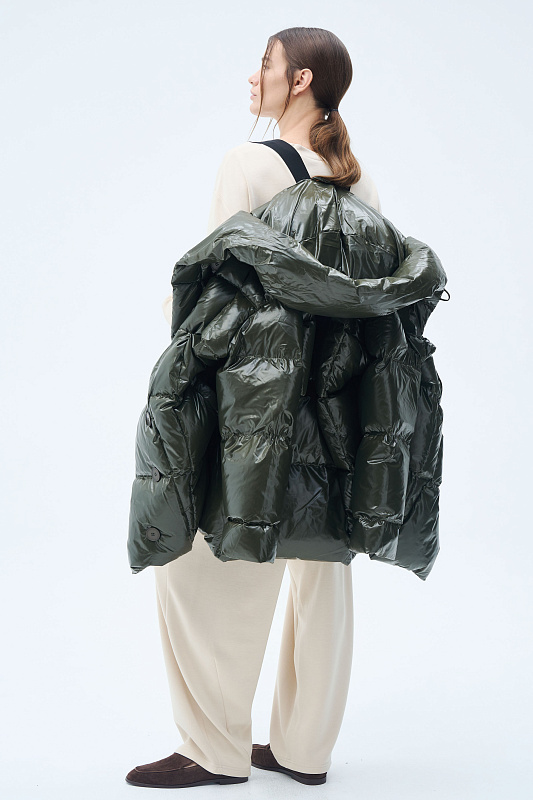 Силуэт пончо-квадрат — это свободный и удобный фасон, как форма выражения образа. Тут соединяется чёткая вертикаль и горизонталь. Впечатление высокого статуса и надёжности. Немного расклешенный к низу силуэт подчеркнут линией ассиметричной строчки. Застёгивается куртка на пуговицы с навесными петлями. Навесные петли— это особое искусство. Ещё их называют воздушные. Функциональные детали, без которых сложно представить современного человека: глубокие удобные карманы, капюшон, крой которого продуман так, что не ограничивает обзор и не мешает движениям, резинка внутри рукава, которая обеспечивает более плотное прилегание к запястью. Капюшон не отстёгивается и придаёт образу завершённость. За сохранение тепла отвечает отборный гусиный пух с показателем fill power 700. Такой наполнитель позволяет носить пуховик при морозах до -15 градусов. На внутренней стороне вшиты эластичные лямки, которые при необходимости позволяют не снимать куртку полностью, а просто скидывать с плеч. Модель куртки — маст-хэв современной модницы.