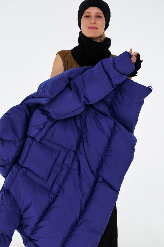 Легкий пуховик с ассиметричной застежкой на пуговицы. Объемный воротник, переходящий в глубокий капюшон. Выполнен из облегченной водонепроницаемой и одновременно дышащей ткани. За сохранение тепла отвечает отборный гусиный пух с показателем fill power 800. Такой наполнитель позволяет носить пуховик при морозах до -25 градусов. Свободный крой и удобные карманы в боковых швах обеспечивают максимальный комфорт. На внутренней стороне вшиты эластичные лямки, которые при необходимости позволяют не снимать куртку полностью, а просто скидывать с плеч. Внутри рукава предусмотрена деликатная резинка, обеспечивающая защиту от поддувания, а по низу - регулируемая кулиска. На спине пуховика эффектная отстрочка в виде логотипа бренда.