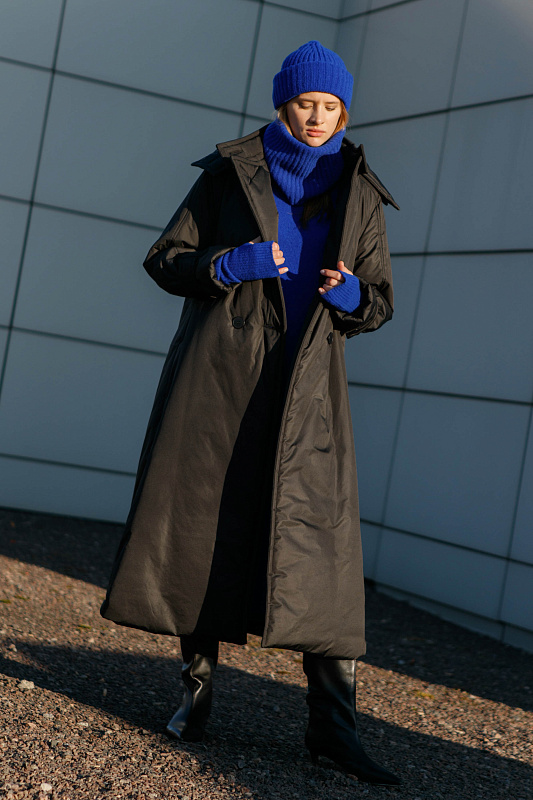 Лаконичное и одновременно стильное, длинное и уютное пальто с современным наполнителем. Двойной воротник-стойка с запахом и теплый отстегивающийся капюшон с застежкой на пуговицу защитят от ветра и холода. Комфортный крой в стиле оверсайз с цельнокройной кокеткой по спинке, переходящей в рукава. Застежка на пуговицы с внутренней и внешней стороны. Удобные карманы в боковых швах. Свободные рукава дополнены изысканными патами на манжетах. Мягкая подкладка из шелковистой вискозы.
