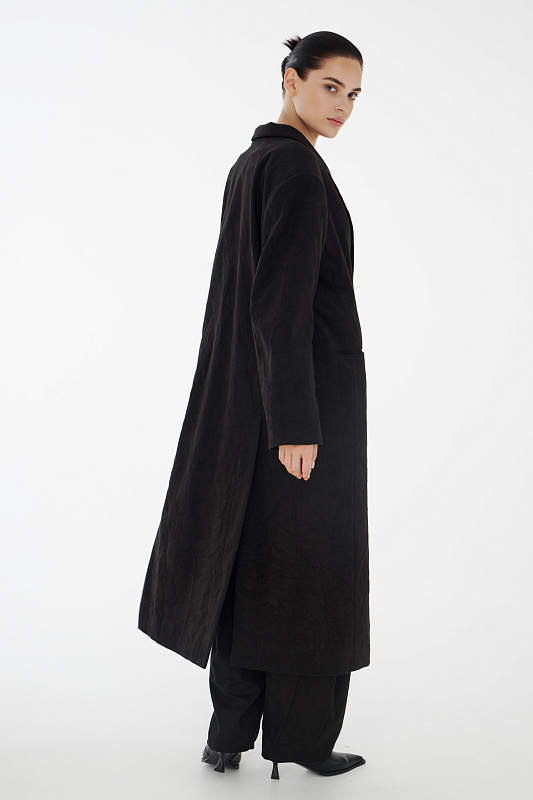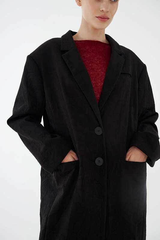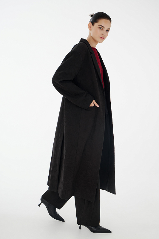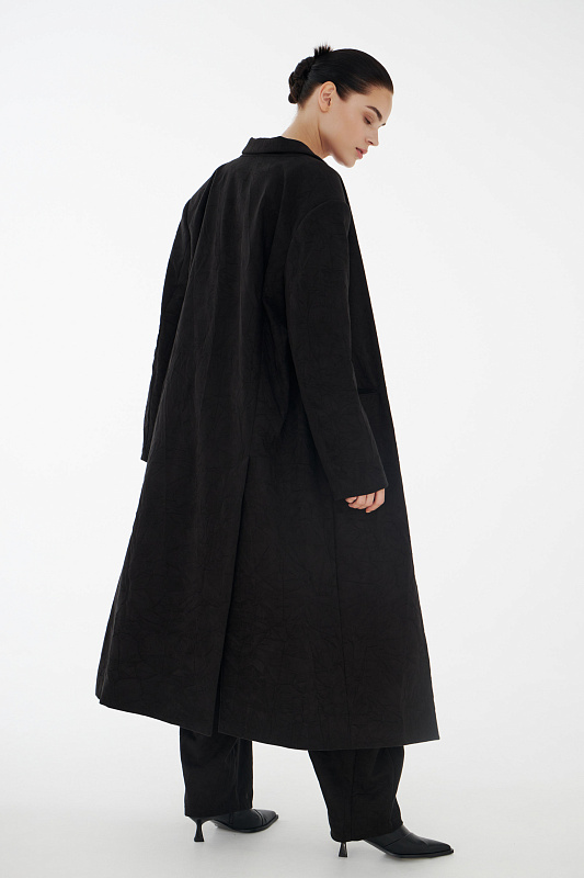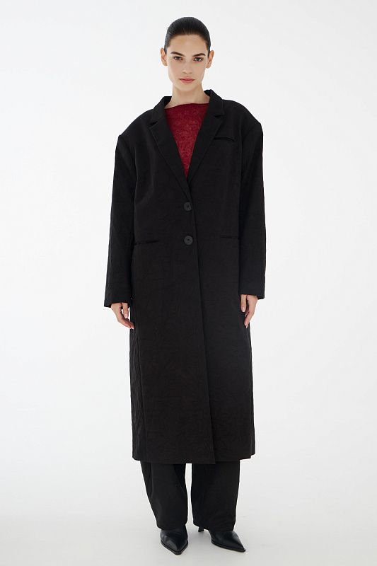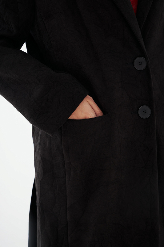 Вальяжное креативное однобортное пальто выполнено из мягкого бархатистого хлопка с эффектом помятости.