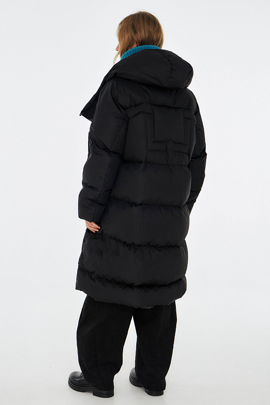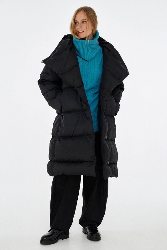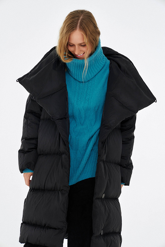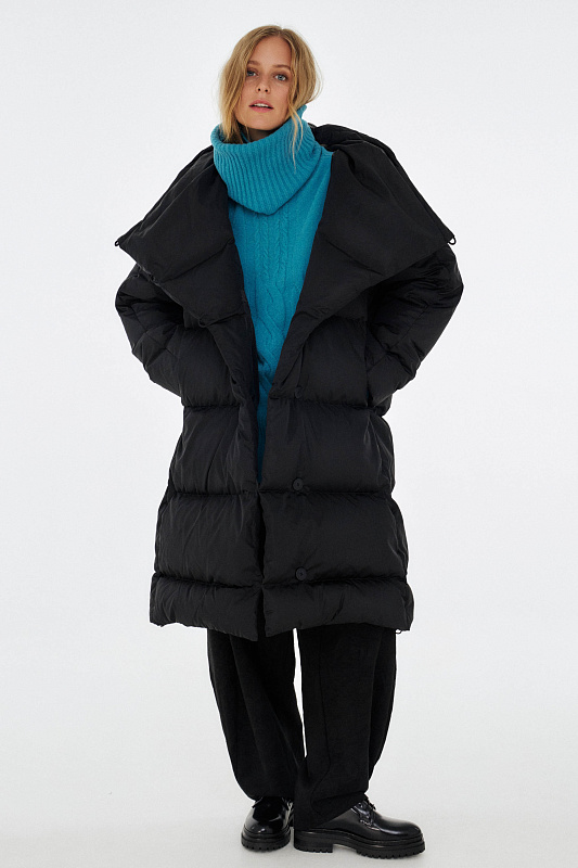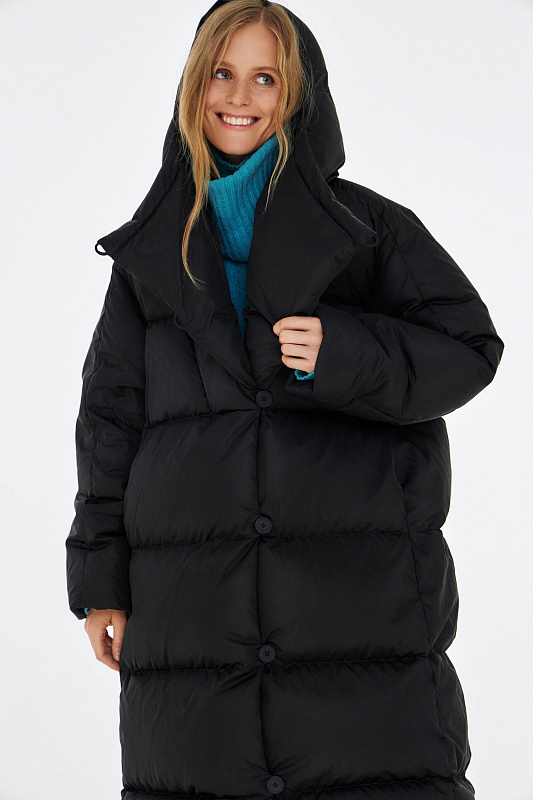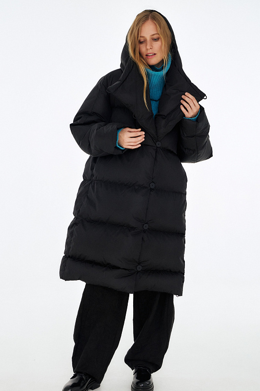 Удлиненный пуховик с ассиметричной застежкой на пуговицы. Объемный воротник, переходящий в глубокий капюшон. Выполнен из облегченной водонепроницаемой и одновременно дышащей ткани. За сохранение тепла отвечает отборный гусиный пух с показателем fill power 800. Такой наполнитель позволяет носить пальто при морозах до -25 градусов. Свободный крой и удобные карманы в боковых швах обеспечивают максимальный комфорт. На внутренней стороне вшиты эластичные лямки - резинки, которые при необходимости позволяют не снимать пальто полностью, а просто скидывать с плеч. Внутри рукава предусмотрена резинка, обеспечивающая защиту от поддувания, а по низу - регулируемая кулиска. На спине пуховика эффектная отстрочка в виде логотипа бренда.