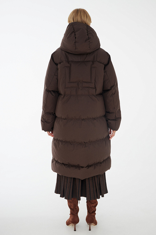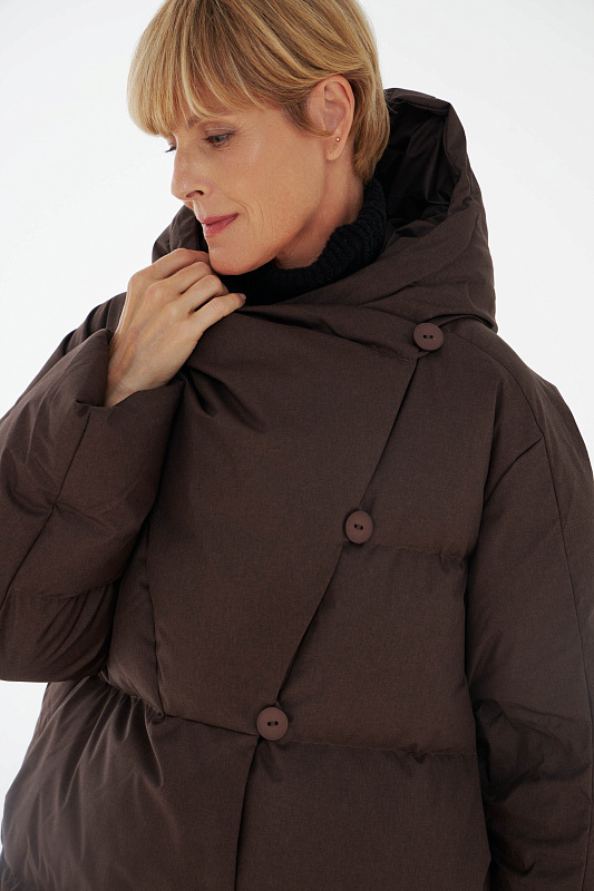 Удлиненный пуховик с ассиметричной застежкой на пуговицы. Объемный воротник, переходящий в глубокий капюшон. Выполнен из облегченной водонепроницаемой и одновременно дышащей ткани. За сохранение тепла отвечает отборный гусиный пух с показателем fill power 800. Такой наполнитель позволяет носить пальто при морозах до -25 градусов. Свободный крой и удобные карманы в боковых швах обеспечивают максимальный комфорт. На внутренней стороне вшиты эластичные лямки - резинки, которые при необходимости позволяют не снимать пальто полностью, а просто скидывать с плеч. Внутри рукава предусмотрена резинка, обеспечивающая защиту от поддувания, а по низу - регулируемая кулиска. На спине пуховика эффектная отстрочка в виде логотипа бренда.
