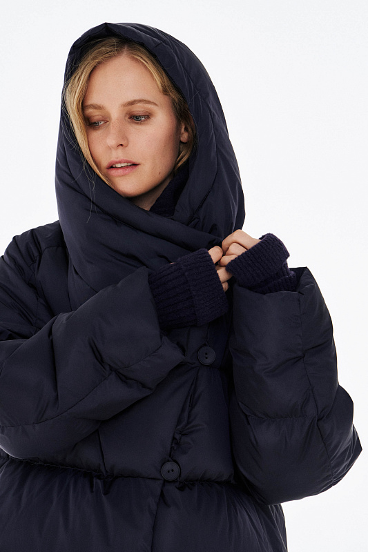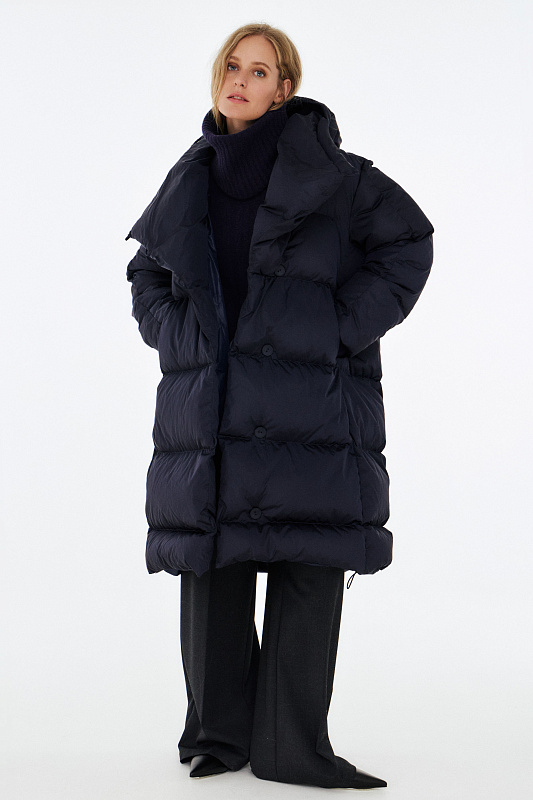 Удлиненный пуховик с ассиметричной застежкой на пуговицы. Объемный воротник, переходящий в глубокий капюшон. Выполнен из облегченной водонепроницаемой и одновременно дышащей ткани. За сохранение тепла отвечает отборный гусиный пух с показателем fill power 800. Такой наполнитель позволяет носить пальто при морозах до -25 градусов. Свободный крой и удобные карманы в боковых швах обеспечивают максимальный комфорт. На внутренней стороне вшиты эластичные лямки - резинки, которые при необходимости позволяют не снимать пальто полностью, а просто скидывать с плеч. Внутри рукава предусмотрена резинка, обеспечивающая защиту от поддувания, а по низу - регулируемая кулиска. На спине пуховика эффектная отстрочка в виде логотипа бренда.